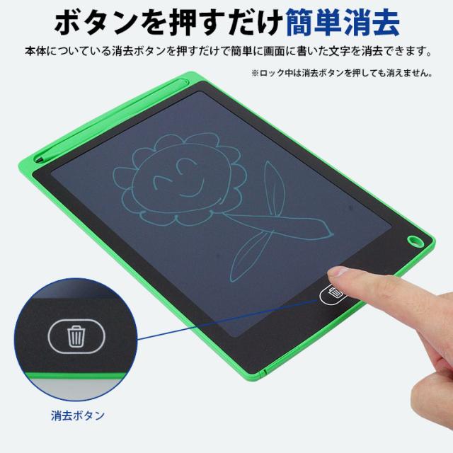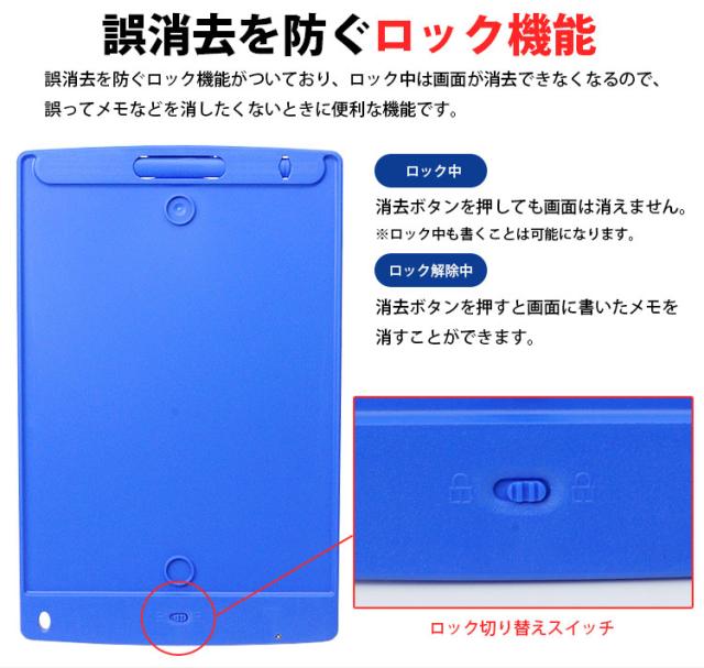 誤消去を防ぐロック機能がついており、ロック中は画面が消去できなくなるので、誤ってメモなどを消したくないときに便利な機能です。