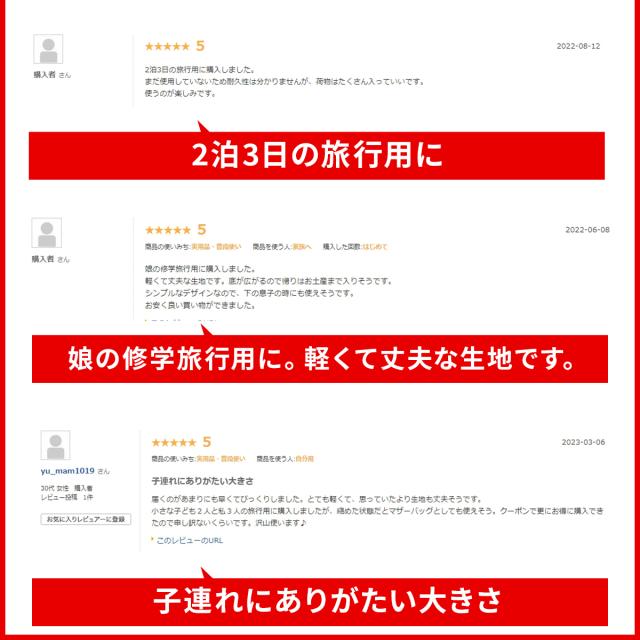 - 夫婦で一泊旅行をするのに、荷物がちょうど収まりました。車移動だったので、キャリーバッグは大袈裟だと思い購入。発送も早く助かりました。