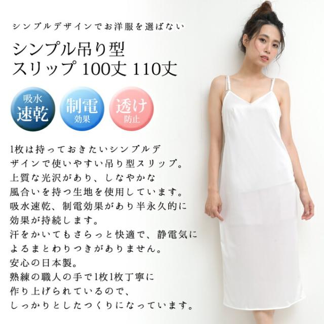 1枚は持っておきたいシンプルデザインで使いやすい吊り型スリップ。上質な光沢があり、しなやかな風合いを持つ生地を使用しています。吸水速乾、制電効果があり半永久的に効果が持続します。汗をかいてもさらっと快適で、静電気によるまとわりつきがありません。安心の日本製。熟練の職人の手で1枚1枚丁寧に作り上げられているので、しっかりとしたつくりになっています。装飾は一切せず、シンプルなデザインにする事でかさばることなく、インナーの透け防止にぴったりです。お胸に接ぎ線をいれることで立体的になりお胸に綺麗に沿うラインを作り出します。吊り型なので、肩紐が細くチラ見えしにくいデザインです。