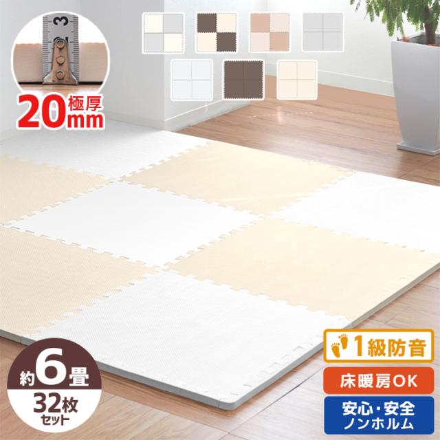ジョイントマット 大判 極厚 厚手 2cm 20mm 60cm 6畳 32枚 サイドパーツ付 床暖房対応 抗菌 ノンホル 単色 洗える PE ジョイント マット 赤ちゃん フロアマット プレイマット 防音 断熱 送料無料 洗える カーペット ベビー ペット ペット用
