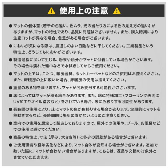 | 注意事項 | ・マットの個体差(若干の色違い、色ムラ、光の当たり方による色の見え方の違い)がありますが、マットの特性であり、品質には問題ございません。また、購入時期により生産ロットが異なる場合、色差がある場合がございます。 ・においが気になる際は、風通しのよい日陰などに干してください。においによる返品はお受けできませんので、においの気になる方はその旨をご了承の上ご購入をお願いいたします。 ・製造過程において生じる、粉末や油分がマットに付着している場合がございます。その場合は、濡れた雑巾などで水拭きしてからご使用ください。 ・マットの上では、こたつ、暖房器具、ホットカーペットなどのご使用はお控えください。また、床暖房の上に敷いた場合、床暖房の使用は控えてください。 ・重量物を載せますと、マットが凹み変形する恐れがあります。 ・床によってはマットが滑る場合があります。また、床に特殊加工(フローリング表面にUV加工やオイル塗装など)をされている場合、床に色移りする可能性があります。 ・長時間の使用により、床にマットの色が色移りする場合がございます。定期的にマットを移動させるなど、長時間同じ場所に置かないようにご注意ください。 ・室内での使用を想定して製造しておりますので、屋外での使用や、プール、お風呂などでの使用は避けてください。 ・材質の特性上、寸法(厚み、大きさ等)に多少の誤差がある場合がございます。あらかじめご了承ください。 ・ご使用環境や経年劣化などにより、マット自体が変形する場合がございます。追加で敷いた際に、マットが合わない場合がありますが、こちらは返品や交換の対象外となります。 ・サイドパーツ単体の販売は行っておりません。サイドパーツをカットして使用する際はご注意下さい。 ・商品は、モニターによって色合いが異なって見える場合があります。 ・仕様・デザインは改良のため予告なく変更することがあります。 ・床材との温度差で製品が反る場合があります。 |