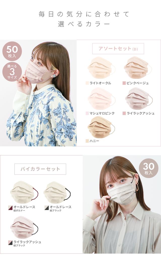 | バリエーション | 【アソートセット】 ・アソートD(選べる3サイズ)大人可愛いくすみカラー5色 ・アソート(子ども向け)かわいいパステル&ナチュラルカラー5色 【バイカラータイプ】30枚入 ・グレージュ×ボルドー ・グレージュ×ブラック ・オールドレース×ボルドー ・オールドレース×ブラック ・ライラックアッシュ ・ライトオークル ・ピンクベージュ ・ピンククォーツ ・ハニー ・マシュマロピンク ・アイスグレー ・ホワイト 【ノーマルタイプ】50枚入 -血色カラーシリーズ- ・ピンククォーツ ・ライトオークル ・ピンクベージュ ・マシュマロピンク ・ライラックアッシュ ・ハニー ・ローズ ・ピーチメルバ ・ミルクティースモア -シャーベットカラーシリーズ- ・ペールラベンダー ・シュガーピンク ・ミスティサボン ・アイシーミモザ ・ミントミキサー -カジュアルカラーシリーズ- ・デニムヘイズ ・フェザーマリン ・ウォームグレー ・アイスグレー ・ネイビー ・ダークグレー ・ブラック ・ホワイト 【接触冷感タイプ】 ・ライラックアッシュ ・ライトオークル ・ピンクベージュ ・ハニー ・マシュマロピンク ・アイスグレー ・ホワイト |