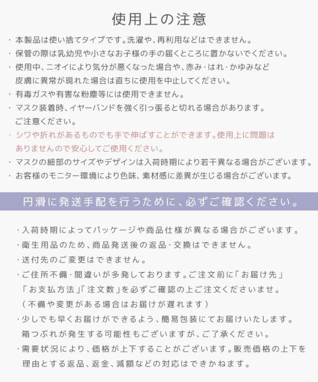 | 特徴 | 【特注仕様】両面同色・耳紐同色 10枚ずつ個包装 3層構造 99%カット高密度フィルター 平ゴム採用 耳が痛くなりにくい 風邪予防 飛沫対策 花粉対策 PM2.5対策 ハウスダスト対策 |