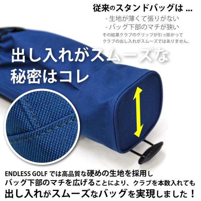 ENDLESS GOLFでは高品質な硬めの生地を採用しバッグ下部のマチを広げることにより、