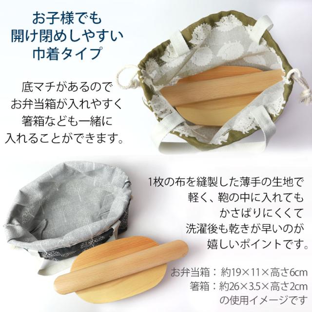 底マチがあるので、お弁当箱が入れやすく、箸箱なども一緒に入れることができます。