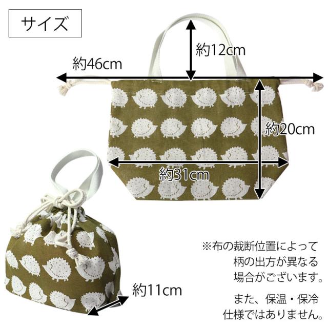 | 商品説明 | 持ち運びに便利な持ち手付きのお弁当巾着袋です。当店の曲げわっぱ弁当箱にぴったりです。 デザインも豊富で迷いそう。豊富なデザインからお気に入りをお選びください。 色違いで揃えたり、気分転換に別柄を選んだり、お気に入りの巾着袋で素敵なランチタイムを♪ 毎日使うものだから洗い替え用もお勧めします。 巾着タイプなのでお子様でも開け閉めしやすいのが嬉しいですね。 底マチがあるので、お弁当箱が入れやすく、箸箱なども一緒に入れることができます。 紐で絞って巾着型に、絞らずそのままトート型の2WAYで使え便利です。 お弁当袋としてはもちろん、小物を入れたり、ポーチとしても可愛くお使いいただけます。 1枚の布を縫製した薄手の生地で軽く、鞄の中に入れてもかさばりにくくて洗濯後も乾きが早いのが嬉しいポイントです。 当店の曲げわっぱとセットでプレゼントしても喜ばれます。 |