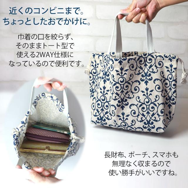 紐で絞って巾着型に、絞らずそのままトート型の2WAYで使え便利です。