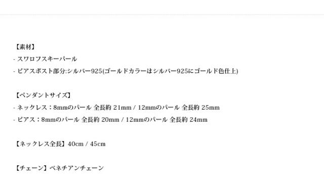| サイズ | - ネックレス:8mmのパール 全長約 21mm / 12mmのパール 全長約 25mm - ピアス:8mmのパール 全長約 20mm / 12mmのパール 全長約 24mm |