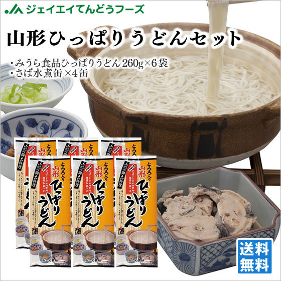 ジェイエイてんどうフーズ 山形 お土産 送料無料 ひっぱりうどんセット みうら食品 さば缶 ※一部地域は別途送料追加