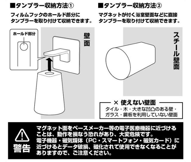 フィルムフック取り付けホルダーをフィルムフックで取り付け、タンブラー底面とマグネットでくっつけて収納します。