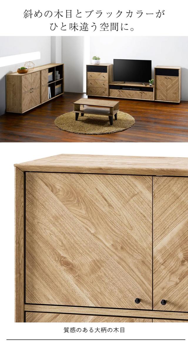 | 斜め方向に木目が入る特徴的な矢張り調のチェスト。 天然木のような風合いのシートを採用。 木目がしっかりと見える質感のある木目化粧にアンティーク調のブラック取っ手が印象的。 木扉内は高さに合わせて調節できる便利な可動棚で隠して置きたい小物やソフト類をスッキリ収納できます。 引き出し部スライドレールで開け閉めスムーズ。 |