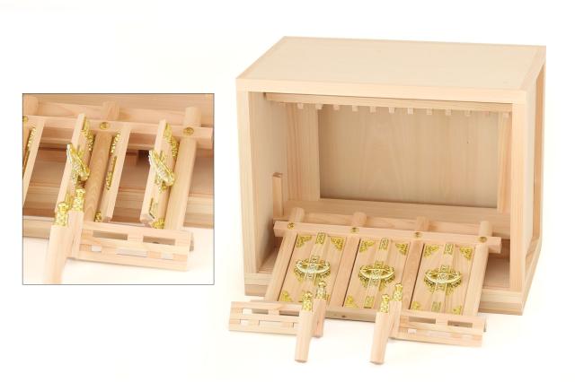お札のお部屋は三社一部屋タイプ。3枚の扉部分が手前に外せる構造のため、簡単にお神札を納める事が出来ます。また、内寸を一杯まで利用できるため外観以上の大きなお神札を納める事が可能です。