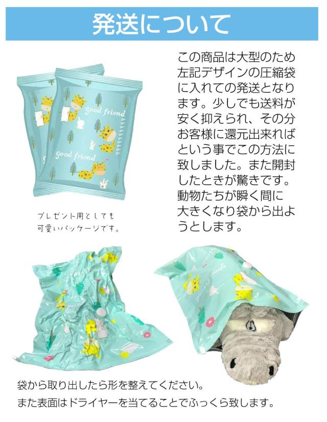 ・モコふわ!抱き枕シリーズの 「もふもふクジラくん 120cmサイズ」です。 ・全長120cmの超大きめサイズ!大人も使えるビッグサイズ! ・中材にはPP綿を充填しているのでふかふかモコモコで気持ちい感触と抱き心地♪ ・可愛いパッケージの圧縮袋でお届けするのでプレゼント用としてもオススメです。 ・中身を知らずに開ければ急激に膨らんで、まるで袋から出ようとするぬいぐるみでサプライズに! |