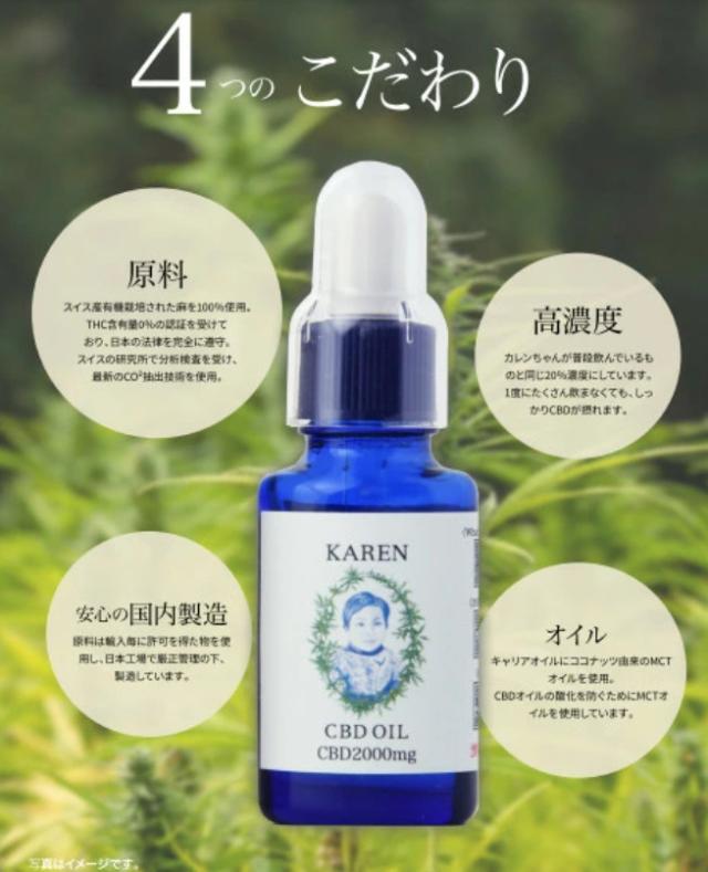 【KAREN】はスイス産の有機栽培された麻からCO2抽出したCBDとCBD以外のCGBなどのカンナビノイドも含まれるブロードスペクトラムCBDオイル。