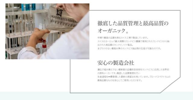 スイス産の遺伝子組み換えをしていない有機栽培された麻を最新のCO2抽出で蒸留し、徹底した品質管理でCBD含有量80%、CGB含有量6%の高純度、高品質のCBD原料を輸入し、有機栽培されたMTCオイルと国内でブレンドしボトリングしています。