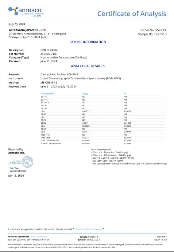■品質:スイス産の遺伝子組み換えをしていない有機栽培された麻を最新のCO2抽出で蒸留し、徹底した品質管理でCBD含有量80%、CGB含有量6%の高純度、高品質のCBD原料を輸入し、有機栽培されたMTCオイルと国内でブレンドしボトリングしています。