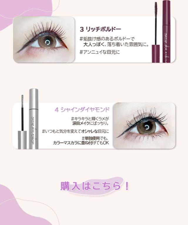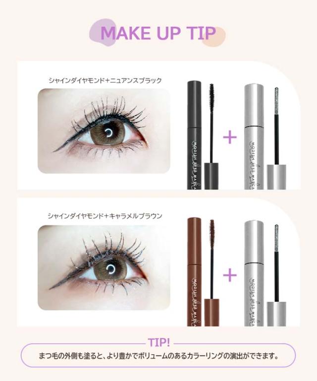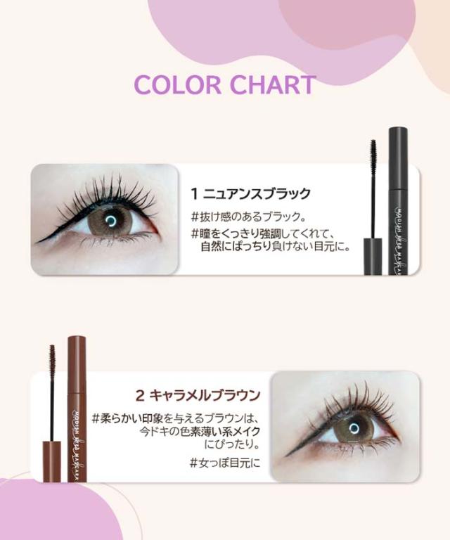 | ご使用方法 | ブラシに適量を取り、余分なマスカラはフチで落とすなどして調整してください。まつげの根元から毛先に向けて、細かく左右にブラシを動かしながら塗ってください。 |