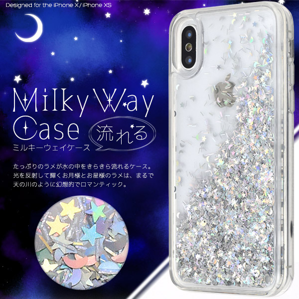 スマホケース iPhoneX iPhoneXS用 ラメが流れる ミルキーウェイケース 装着簡単 スマホカバー 星 月 ラメ キラキラ 天の川風 保護カバー 背面カバー 可愛い オシャレ iPhoneケース アイフォンケース 携帯カバー 携帯ケース お洒落 背面保護 SoftBank au docomo おしゃれ