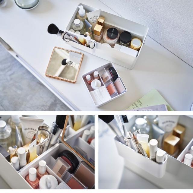 リップ、ファンデーション、アイシャドウなど、種類やサイズに合わせて片付けやすく作られていて、コンパクトで省スペースにまとめることができます。高さがある化粧品類も収納できます。