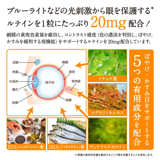 ルテインは、ブルーライトなどの光刺激から目を保護するとされる網膜の黄班色素量を維持し、コントラスト感度(色の濃淡を判別し、ぼやけ、かすみを緩和する視機能)をサポートするとされています。