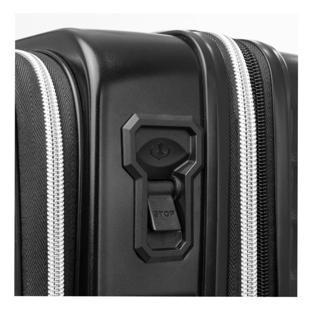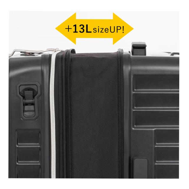 拡張ファスナーを操作することによってマチ幅が7cmアップ。拡張部分の上下には特許技術を用いた型崩れを防止する特殊プレートを内蔵している為、荷物の出し入れ時にスーツケースを横にしても形状が崩れません。本体側面に付いているスイッチを下におろすと、キャスターをストップすることが可能です。狭い場所でも使いやすい縦開きフロントオープン仕様。ノートPC収納スペースを装備しています。従来のキャリーバーより、多くの段階でストップできる段階調整キャリーバーを採用。自分に合った高さで快適な姿勢を保つことが可能です。