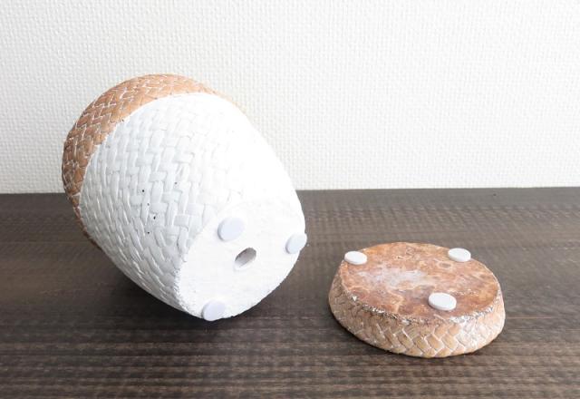 約10mm程度の底穴あり、皿付きなので直接植えこみもOK。鉢本体、受け皿ともに底面にクッション材がついており、室内外どちらでも飾り易い仕上がりとなっています。 |