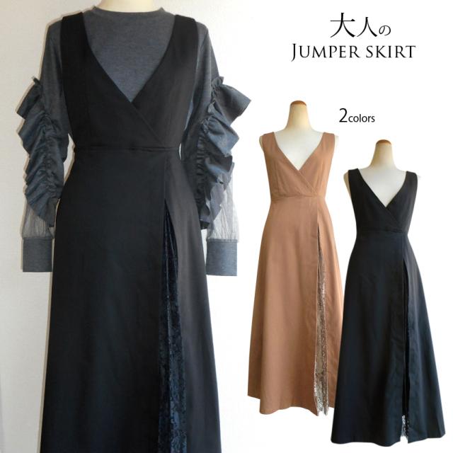 送料無料 ワンピース 深めVネック ジャンパースカート サロペット セール 激安 大人 おしゃれ きれいめ 異素材 切替 スリット レース プリーツ ナチュラル 着痩せ 上品 エレガント ミセス ほっこり かわいい 花柄 ジョーゼット キャメル ブラウン ブラック ロング ミモレ丈