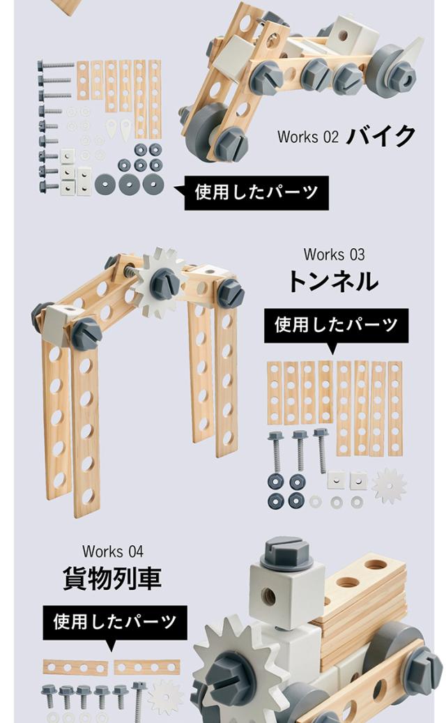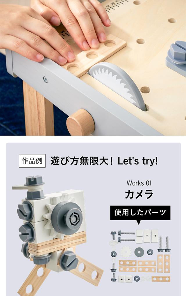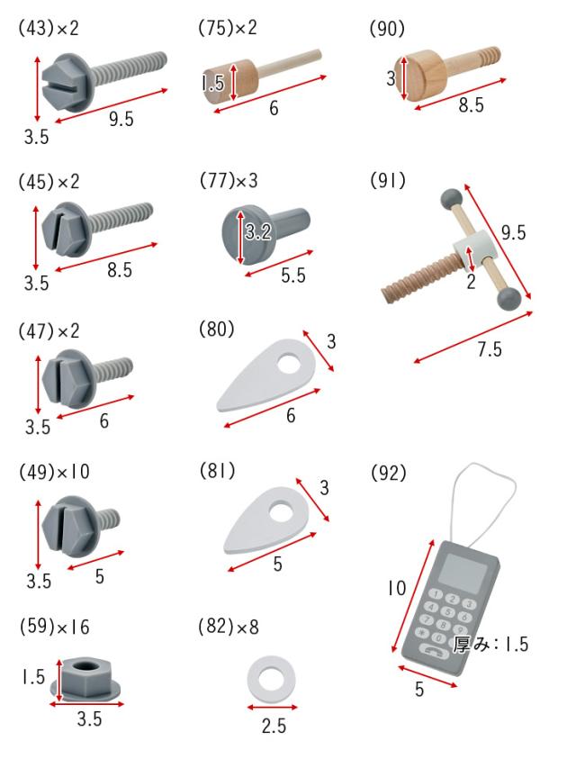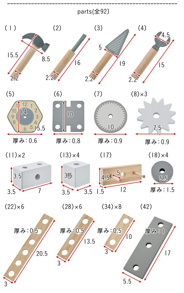本体、パーツ:合板、 MDF、パイン、ヒメツバキ、プラスチック