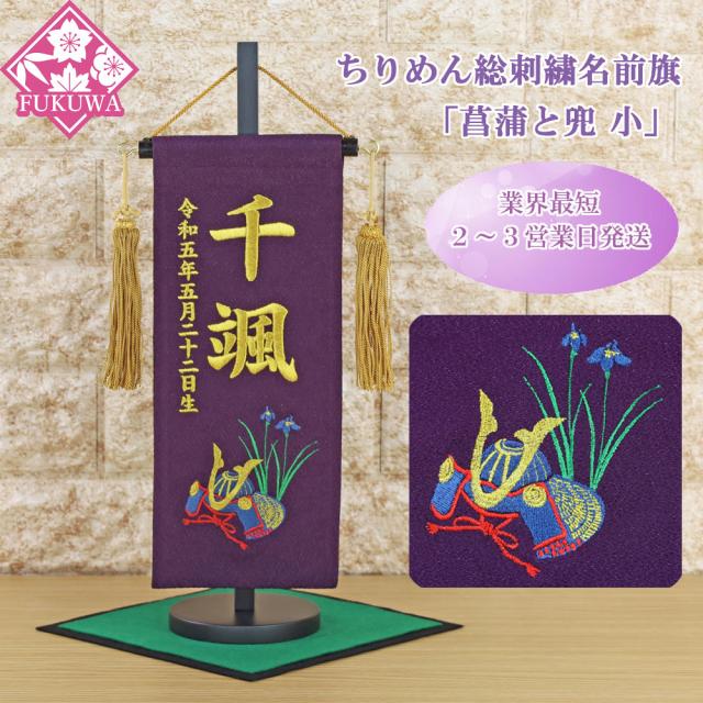 五月人形 名前旗 刺繍 男の子 節句 男旗 金文字刺繍名前入(菖蒲と兜 小 851F 房付き)木製スタンド付 名前旗 名前入 タペストリー飾り