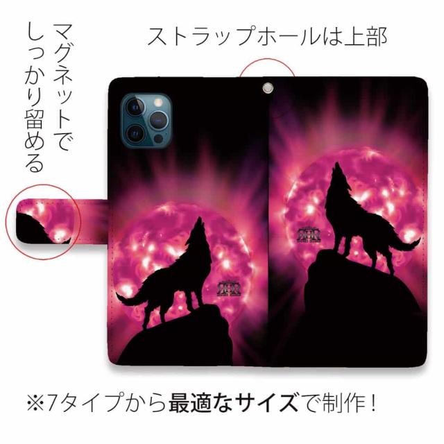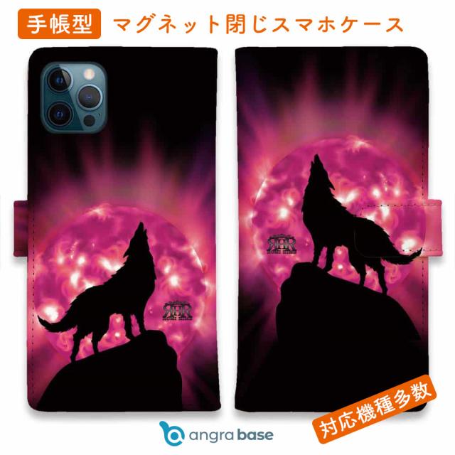 スマホケース 手帳型 カード収納 マグネット iPhone17 Pro Max iPhone Air iPhone16e iPhone16 Pro Max 16 Plus 15 Pro Max Xperia 10 VII Galaxy AQUOS ARROWS Pixel10 XL ROMI HIME 狼 ピンク 月
