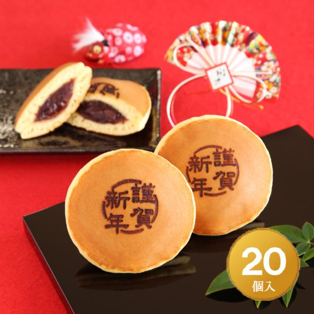 「謹賀新年」焼印入りどら焼き『暁』小倉あん20個入り 送料無料(北海道 沖縄除く) 老舗 和菓子 お年賀 御年賀 正月 元日 元旦 御挨拶 ご挨拶 和スイーツ ギフト 贈り物 お土産 おみやげ 手土産 お祝い 御祝 プチギフト お菓子 どらやき 大阪 呼人堂