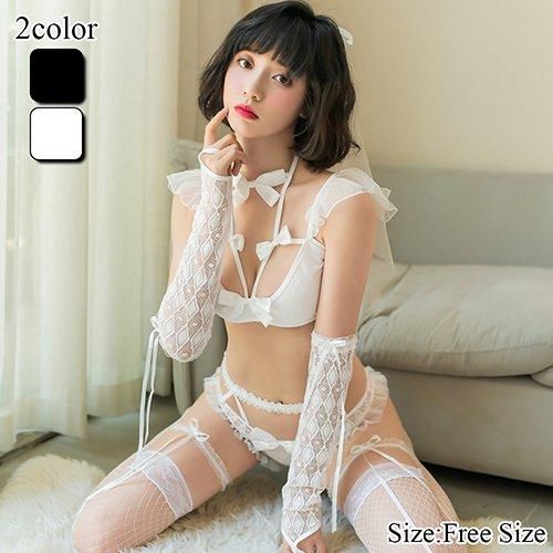 セット内容 : ブラ、ショーツ、ベール、アームカバー、ガーターリング、ストッキング 6点