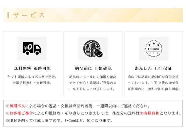 お客様が当店にてお買い上げいただいた印鑑は、ご購入日より、10年以内であれば、無料で彫り直しをいたします。(送料は往復分ご負担ください。)