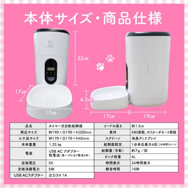 本体: W190×D190×H320? エサ皿:170×170? 本体重量:1.25? コードの長さ:1.5?