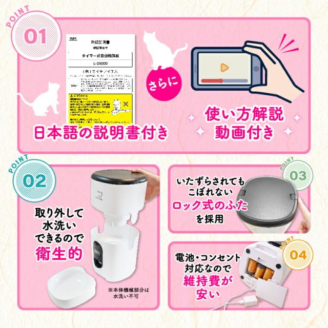 - 注文から商品到着まで迅速に対応していただきました。 夜間や明け方の餌やりもタイマーセットで給餌できるのでペットにも飼い主にとっても良かったです。 電源が使えなくなった場合でも電池で対応できて安心ですね...