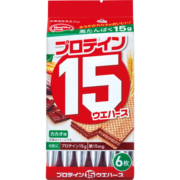 ヘルシークラブ プロテイン15 ウエハース カカオ味 6枚 *ハマダコンフェクト/香ばしいココアウエハースにマイルドなチョコクリームをサンドしました/たんぱく質たっぷり配合/小分けしてありますので好きな分量を調整してお召し上がり頂けます