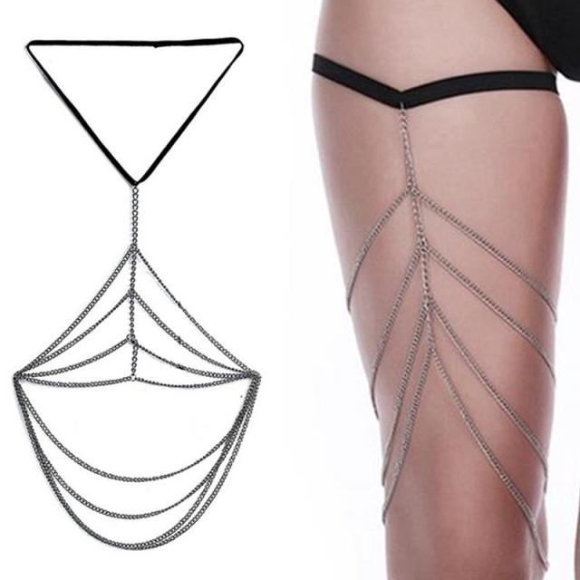 伸縮性のある黒色のレッグバンドに銀色の鎖を4連にしたセクシーなガーターベルトボディチェーン。