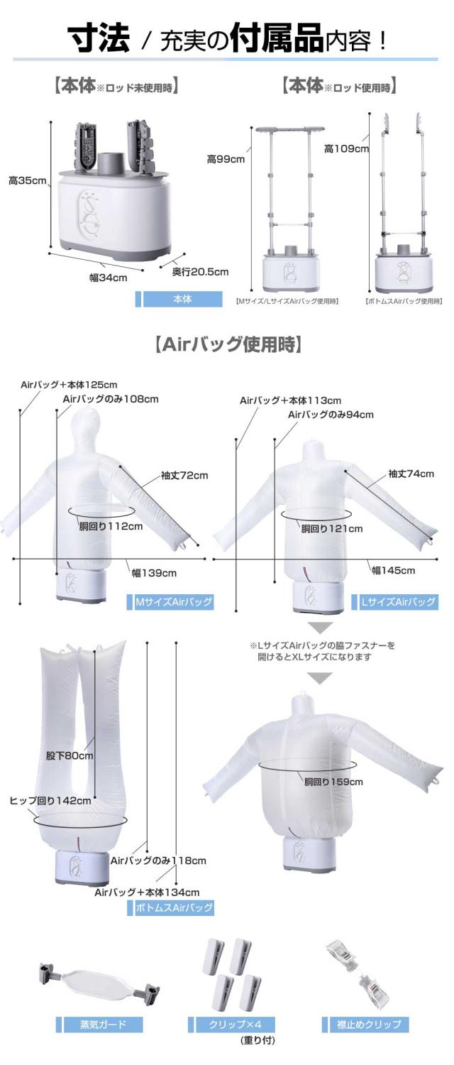 | セット内容 | 本体、蒸気ガード、重り付きクリップ×4、襟止めクリップ、MサイズAirバッグ、L(XL)サイズAirバッグ、ボトムスAirバッグ |