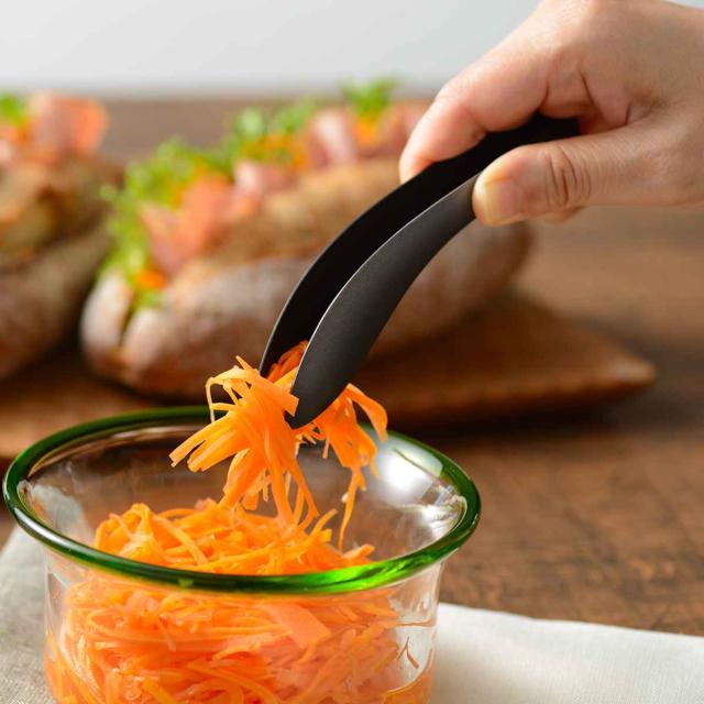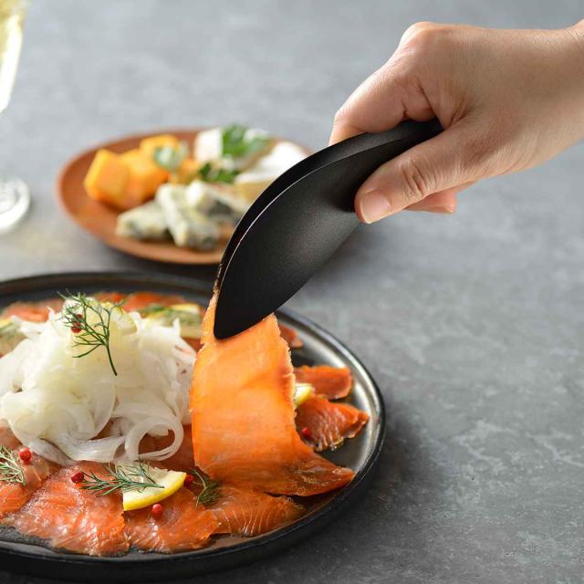 先端が細くなっているので、薄くちぎれやすいサーモンや生ハム、小さな食材も簡単につまむことができるトングです。サラダや大皿料理を取り分けたり、揚げ物の衣を付ける時など器用な先端形状で、指の延長のような使い心地です。独自の加工でやわらかなバネ性を持たせ、自分の指のような感覚で自然に使えます。