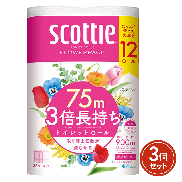 スコッティ フラワーパック 3倍長持ちトイレット 12ロール ダブル 3個セット まとめ買い 日本製紙クレシア