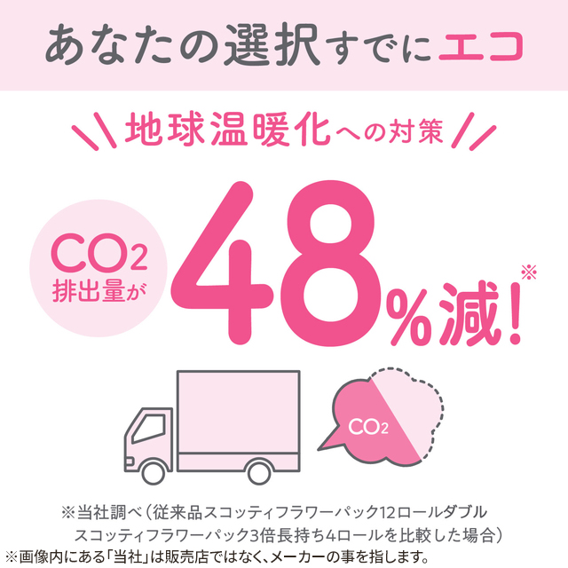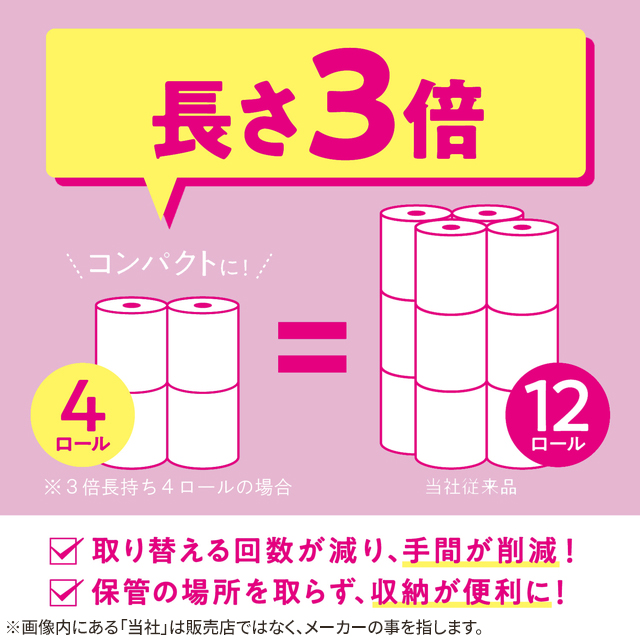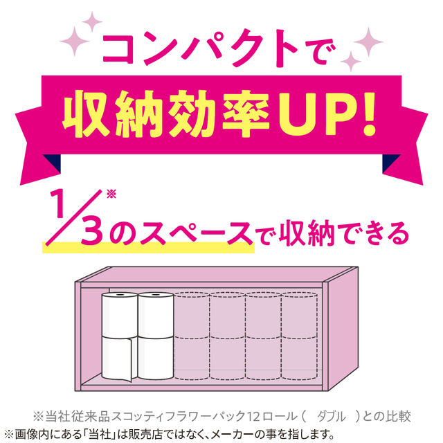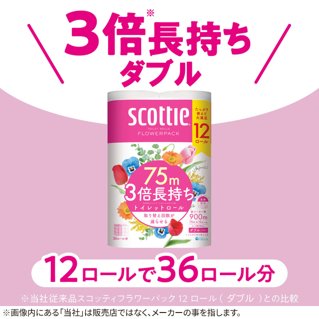 ・12ロールで36ロール分の長さ(1ロールの長さが3倍:スコッティフラワー12ロール比)。・たっぷり使えて取り替えの手間が減り、収納もコンパクト。