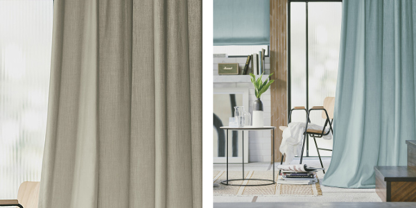 | 安心・安全な防炎加工 火が付いても燃え広がりにくい防炎加工を施しているので、もしもの時も安心です。 | 形態安定加工が施されている カーテンヒダを美しく整える形態安定加工ソフトウェーブ加工が施されています。 |