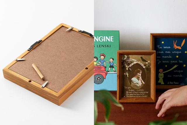 シンプルなので中に入れる写真やポストカードが引き立ちます。表面は透明アクリルボードなので軽くて扱いやすく、重いフレームを置く事ができない場所にも使用できます。