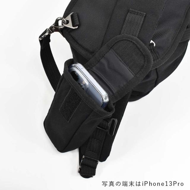 ショルダー部分には取り外し可能なスマホポケットが付いており、背負っている時でもサッと取り出すことが可能です。