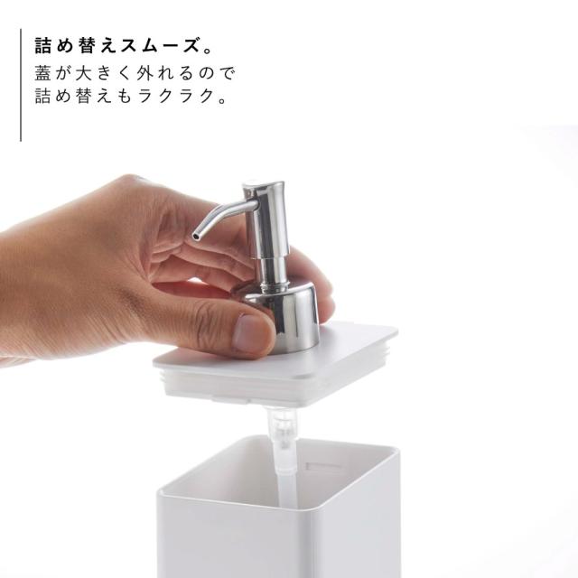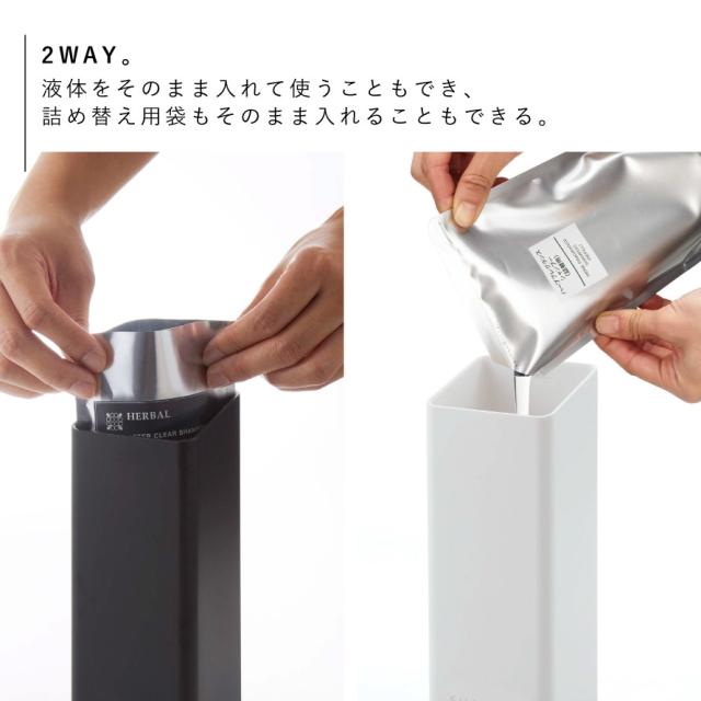 液体をそのまま入れて使うこともでき、詰め替え用袋もそのまま入る便利な2WAY。蓋が大きく外れるので詰め替えもラクラクです。