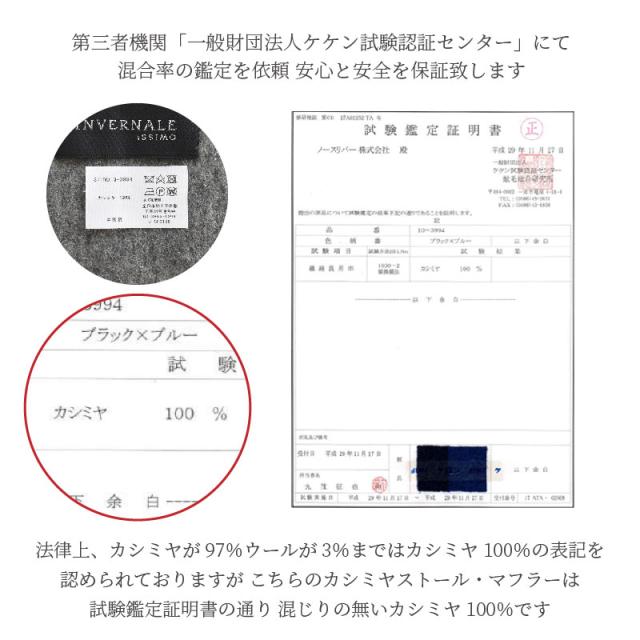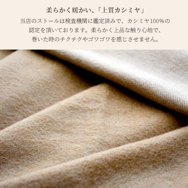 | 特徴 | 当店のストールは検査機関に認定済みで、カシミヤ100%の認定を頂いております。柔らかく上品な触り心地で、巻いた時にチクチクやゴワゴワを感じません。 |