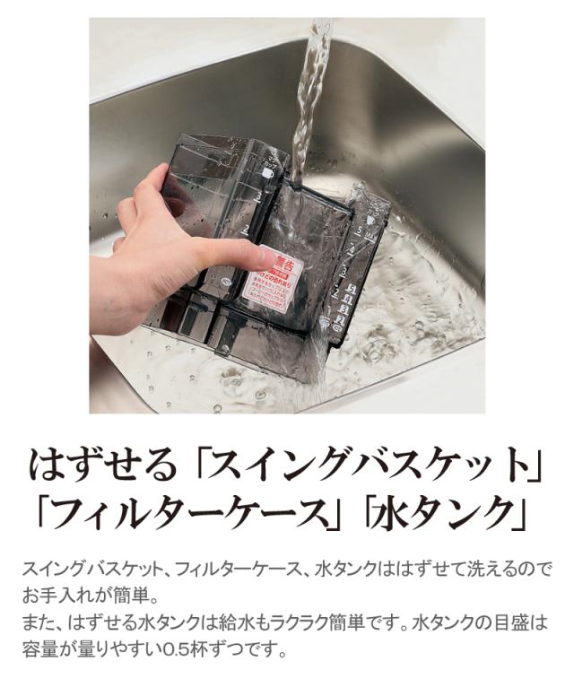 ・スイングバスケット、フィルターケース、水タンクははずせて洗えるのでお手入れが簡単。