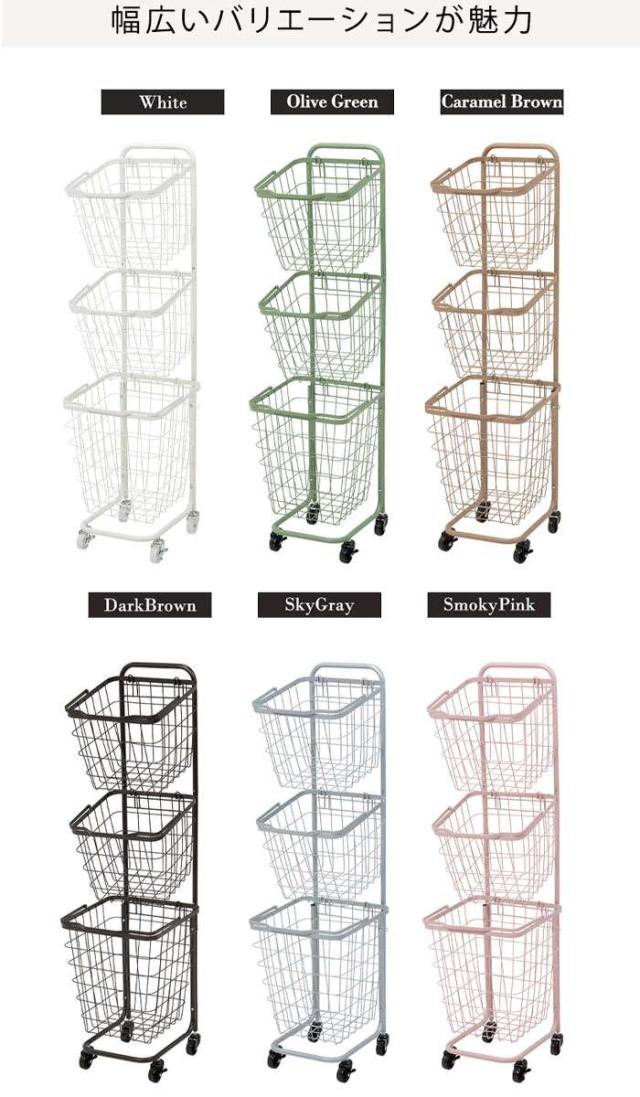 3段ランドリーラック。カラーは、ダークブラウン(4934257277501:2090965700・KR-3971DBR)、オリーブグリーン(4934257277518:2090965800・KR-3971GR)、スカイグレー(4934257277525:2090965900・KR-3971GY)、キャラメルブラウン(4934257277532:2090966000・KR-3971LT)、スモーキーピンク(4934257277549:2090966100・KR-3971PI)、ホワイト(4934257277556:2090966200・KR-3971WH)、です。角型バスケット。持ち運べるバスケットが便利。縦型収納で省スペースに洗濯物を分別できます。・組立式・キャスター付。