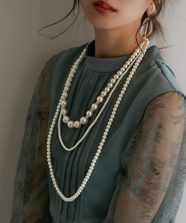 シンプルなパールロングネックレスとフロントにラインストーンをあしらったパールショートネックレスをセットに。