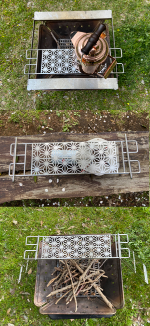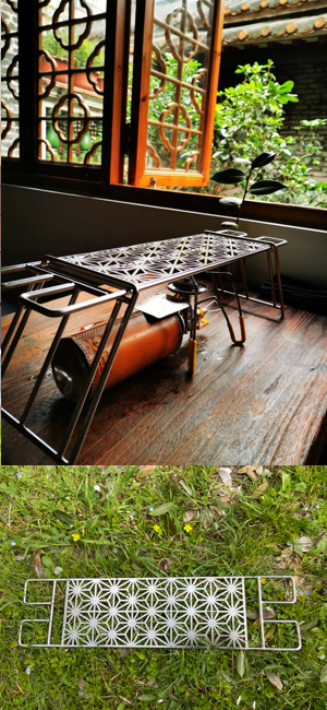 焚き火ゴトクグリルです。麻の葉紋に仕上げの天板付きのため、鉄脚MTG-TLおよびMTG-TSをお好みで使い分けたりバリエーションがあります。焚き火ゴトクだけではなく、ちょっとしたシェルフ、テーブルなどにアイディア次第で、色々と使えます